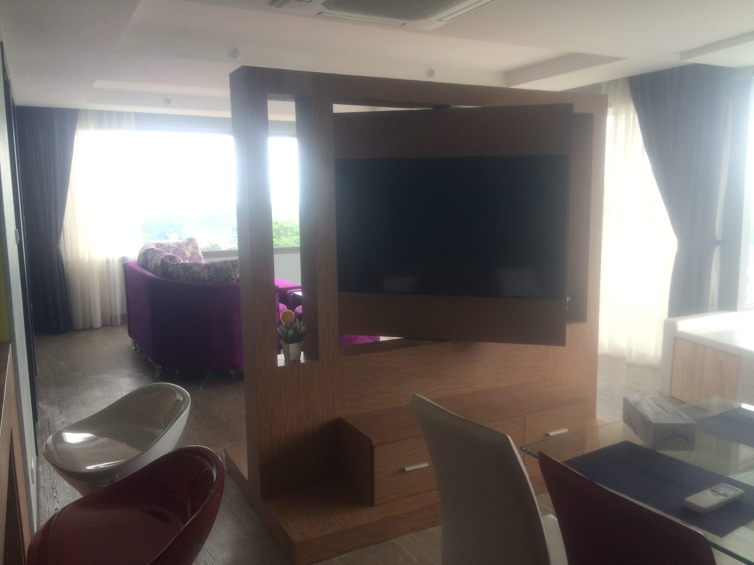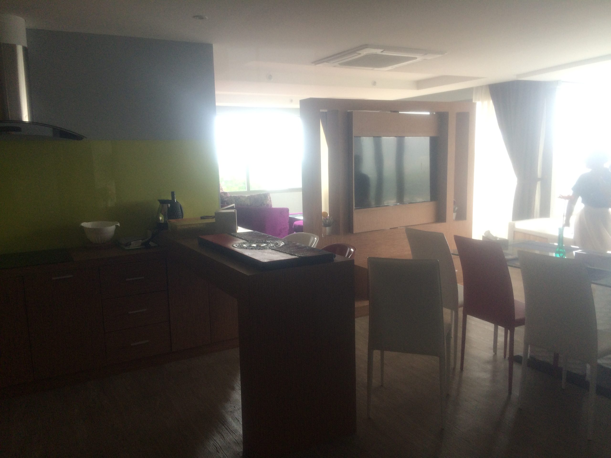 The penthouse is 150,000 THB (£3100) per month and is just .. excessive! Huge open plan lounge, kitchen and dining area, with the lounge and dining area separated by a screen in the middle containing a TV that rotates, so you can watch it wherever you are! The lounge has a massive table that sits 6 people.