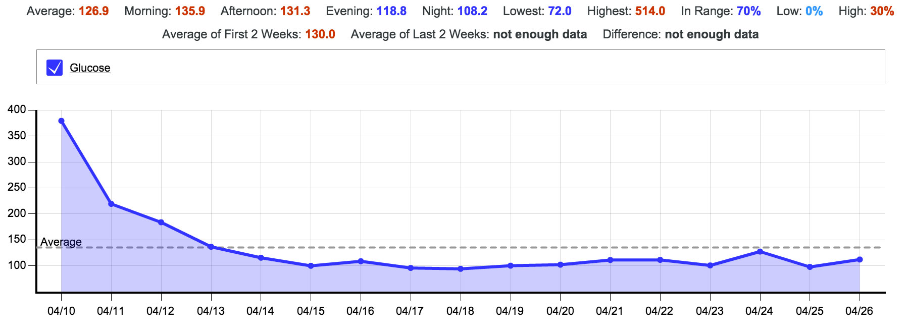 I still haven’t been able to exercise but I’ve been maintaining a pretty good ketogenic, low carb diet over the last couple of weeks, only eating eggs, blueberries, avocado and broccoli. There is an obvious blip on 04/24 however after a day out involving several pints of beer, chicken wings and pie!