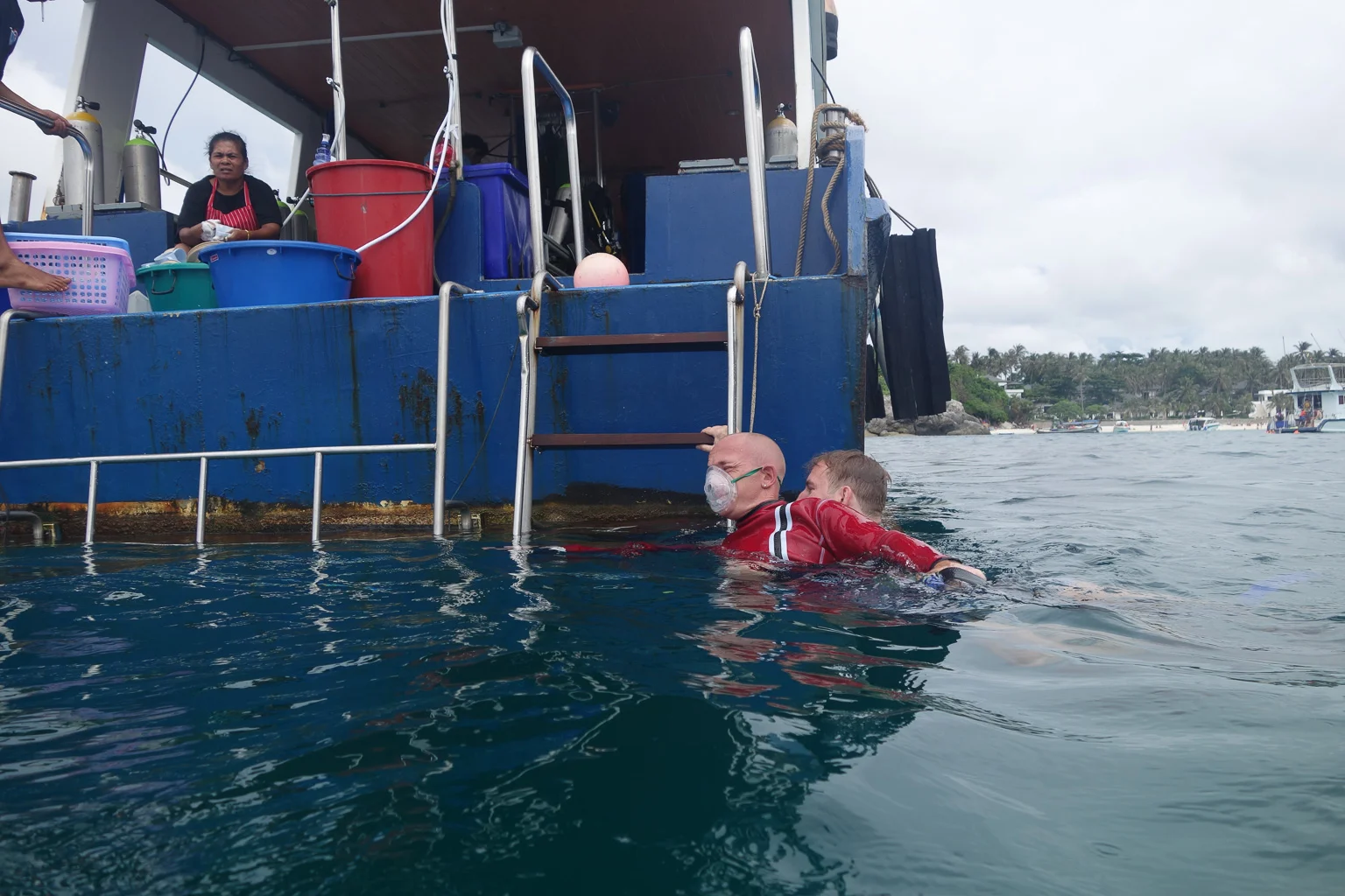 The first open water scenario was surfacing an unresponsive diver, which involved confirming with Dan was OK or not and after identifying that he was unresponsive, bringing him to the surface in a safe, controlled manner. The second open water scenario involved rescuing an unresponsive diver on the surface, using a pocket face mask, delivering rescue breaths and towing the diver to the boat.